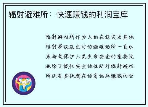 辐射避难所作为人们在核灾或其他辐射事故发生时的避难场所,一直以来都是保护人类生命安全的重要设施。除了提供安全的住所外,辐射避难所还有其他潜在的商机和赚钱机会。本文将从多个方面探讨辐射避难所如何快速赚钱。